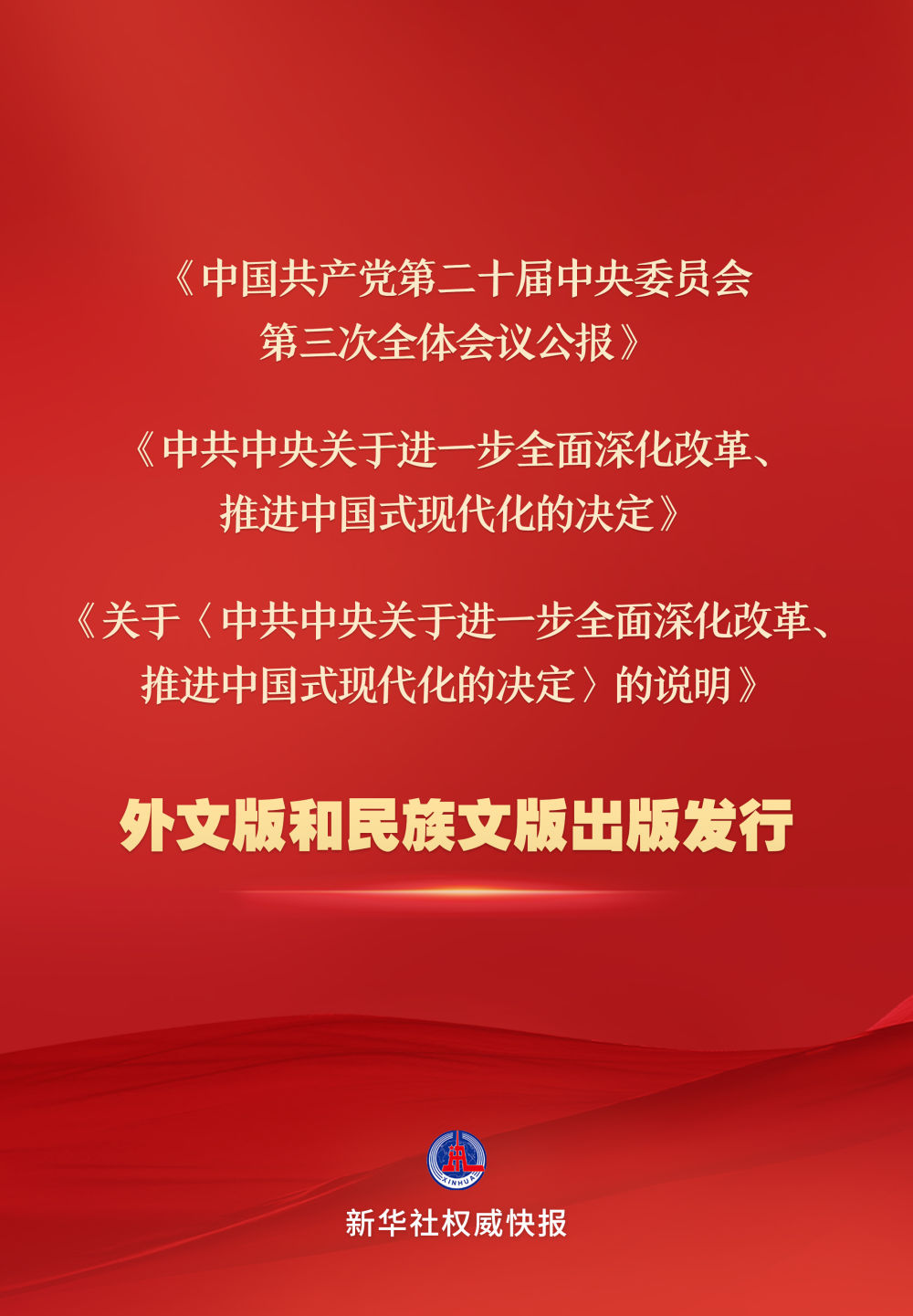 《中国共产党第二十届中央委员会第三次全体会议公报》《中共中央关于进一步全面深化改革、推进中国式现代化的决定》《关于<中共中央关于进一步全面深化改革、推进中国式现代化的决定>的说明》的英文、法文、西班牙文、日文、俄文、德文、阿拉伯文、葡萄牙文、越南文、老挝文等10种外文版已由中央编译出版社、外文出版社出版,面向国内外公开发行。