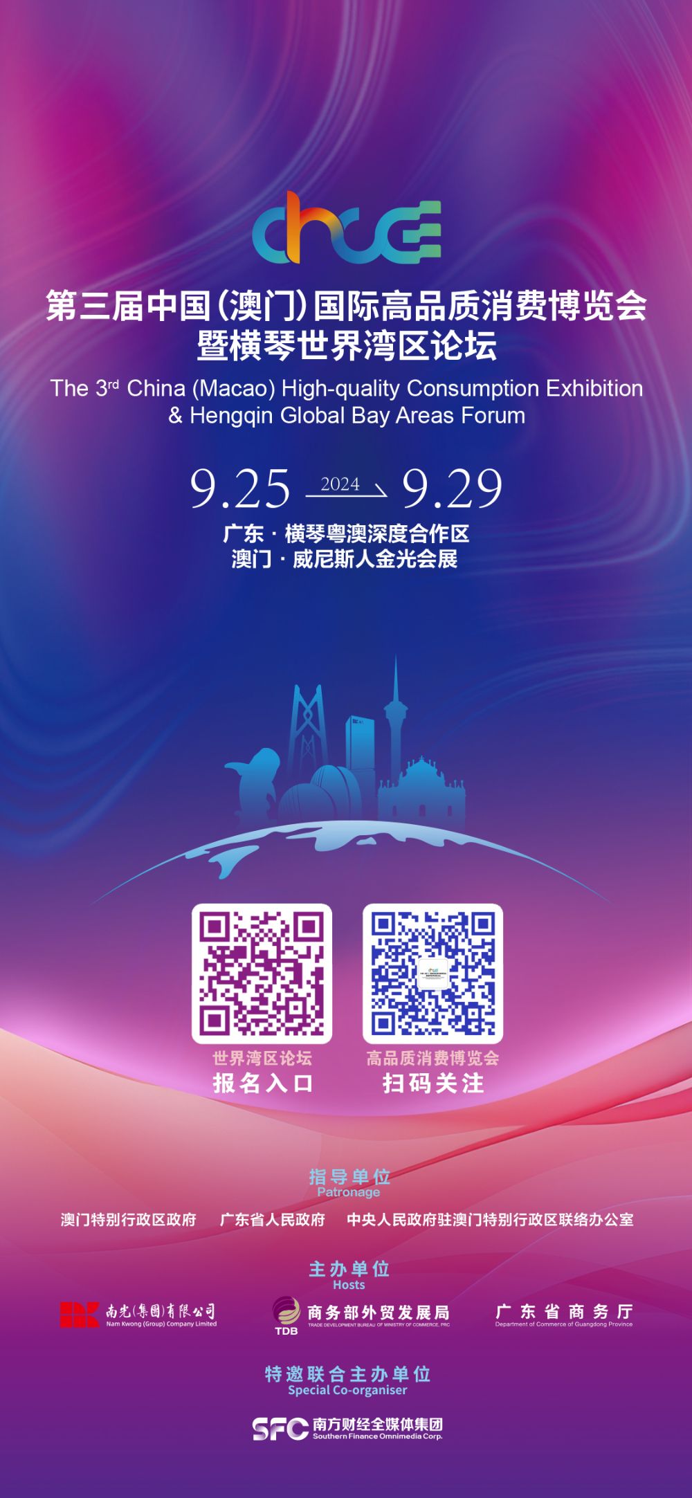 9月25日至29日,第三届中国(澳门)国际高品质消费博览会暨横琴世界湾区论坛(简称:高品会暨世界湾区论坛)将继续以“一会展两地”方式在澳门和横琴举办。