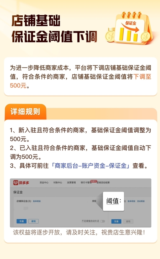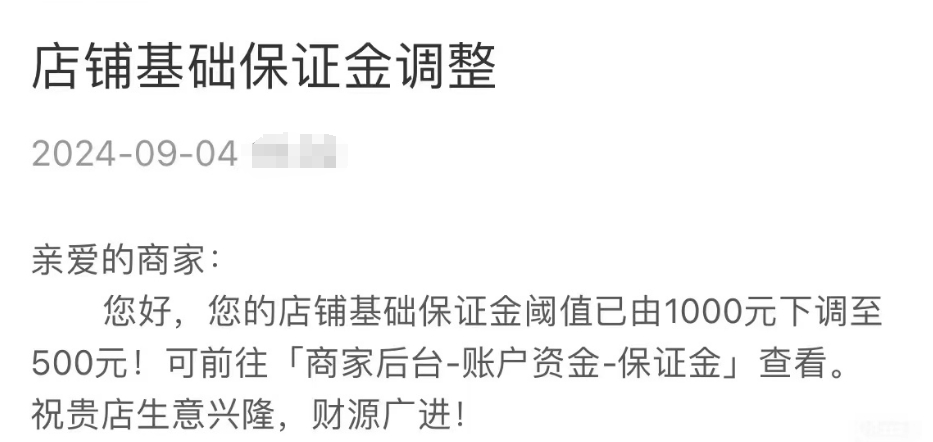 9月4日,木木(化名)的拼多多店铺突然收到站内信息称,店铺的基础保证金阈值已由1000元下调至500元,可前往“商家后台-账户资金-保证金”查看。