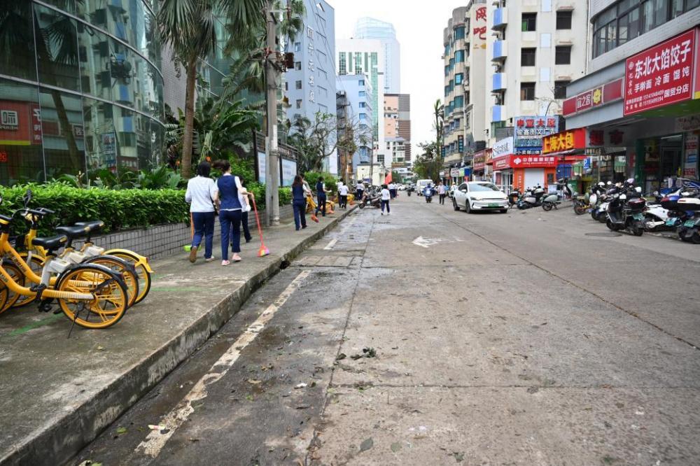 台风“摩羯”带来的狂风暴雨导致许多树木被吹倒,枝叶散落一地,不少店铺的玻璃橱窗也被破坏,碎片散落。面对这一片狼藉,大家分工合作,有的负责清扫落叶和树枝,有的则小心翼翼地捡起玻璃碎片,确保清理工作既高效又安全。