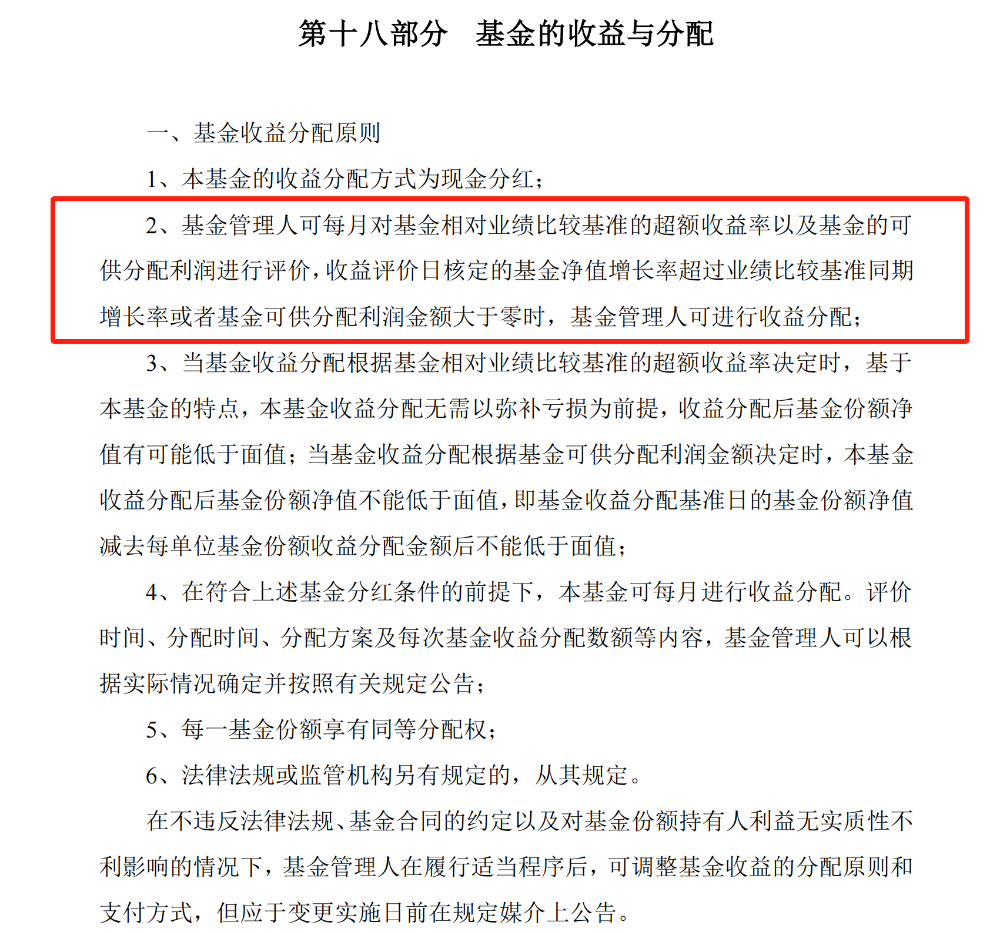 具体来看,国泰中证A500ETF合同表示,基金管理人可每月对基金相对业绩比较基准的超额收益率以及基金的可供分配利润进行评价,收益评价日核定的基金净值增长率超过业绩比较基准同期增长率或者基金可供分配利润金额大于零时,基金管理人可进行收益分配;此外,还表示“在符合基金分红条件的前提下,本基金可每月进行收益分配”。
