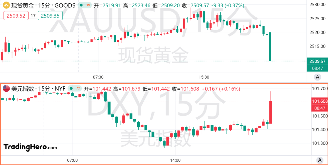 数据公布后,现货黄金短线下挫,失守2510美元。美元指数短线拉升,累涨超30点,非美货币普跌。