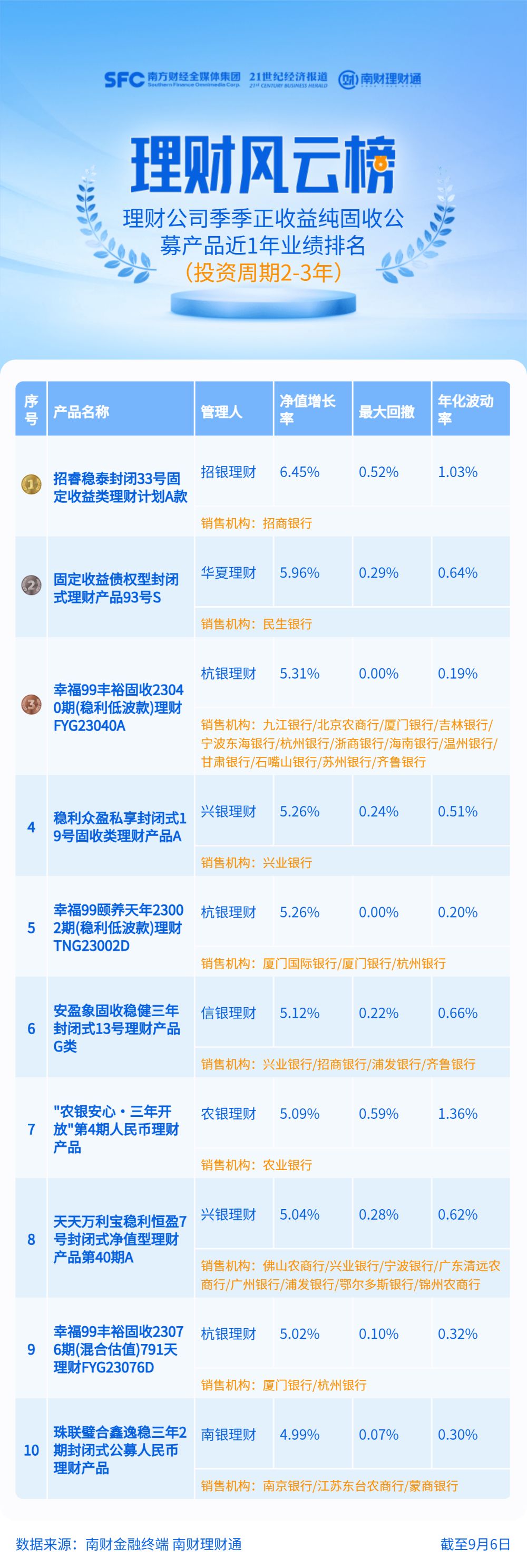 招银理财“招睿稳泰封闭33号固定收益类理财计划A款”、华夏理财“固定收益债权型封闭式理财产品93号S”、杭银理财“幸福99丰裕固收23040期(稳利低波款)理财FYG23040A”近1年净值增长率依次为6.45%、5.96%和5.31%,位列前三。