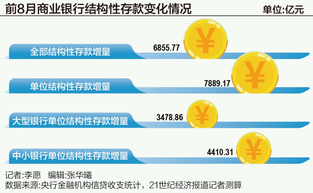 值得注意的是,结构性存款增加的趋势与整体存款增长情况不一致。央行数据显示,今年前8个月存款增加12.88万亿元,其中非金融企业存款减少2.88万亿元,去年同期存款增加20.24万亿元,非金融企业存款增加8890亿元。