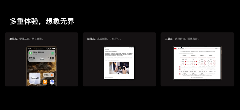 这些一机多能的设计使其可以在单屏态、双屏态、三屏态之间自由切换,手机的生产力能力有了质的飞跃。比如,用户可以根据需求自由调节屏幕尺寸,在浏览网页、观看视频或进行文档编辑时,无需频繁切换应用窗口,实现真正的超沉浸高效多任务操作。