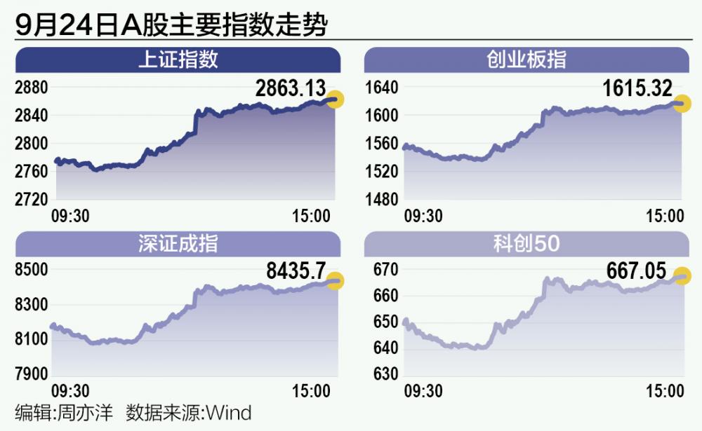 9月24日早间消息公布后,A股三大指数开盘均涨超1%,并于此后持续上行。截至收盘,沪指涨4.15%,收报2863.13点;深证成指涨4.36%,收报8435.70点;创业板指涨5.54%,收报1615.32点,主要宽基指数和31个申万一级行业更是全部收红。