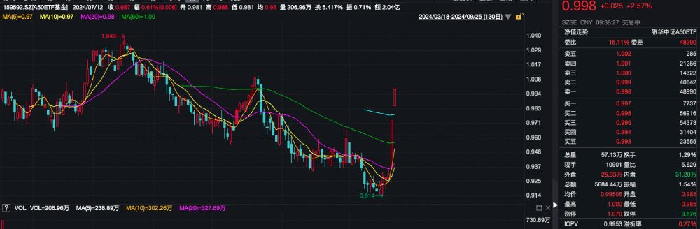 相关ETF方面,A50ETF基金(159592)截至发稿涨2.57%,成交额近5700万元,换手率近1.3%,早盘交投活跃,溢折率0.27%,盘中频现溢价交易。