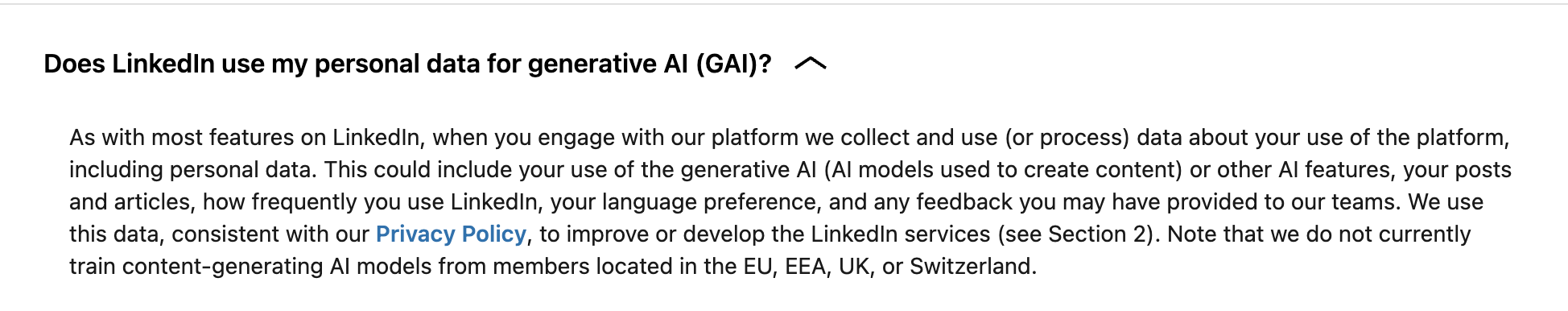 9月18日,媒体报道了一则“LinkedIn未经用户许可,利用用户数据改进其生成式AI产品”的新闻,就此事LinkedIn回复媒体称,“尚未更新其服务条款以反映这一数据处理行为,但将‘很快’更新其服务条款。”换句话说,LinkedIn确认了其曾在较长一段时间内,存在默认使用用户数据训练其 AI 模型的行为。