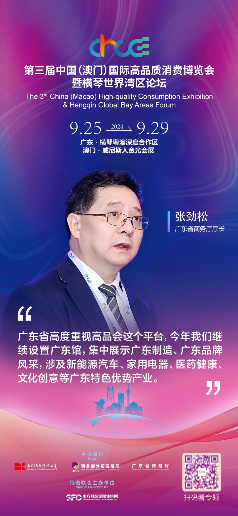 广东省商务厅厅长张劲松在开幕式上表示,在横琴和澳门两地创新举办第三届中国(澳门)国际高品质消费博览会暨横琴世界湾区论坛,是以实际行动深化粤澳等地经贸交流,助力粤港澳大湾区和横琴粤澳深度合作区建设,时机特殊、意义重大。