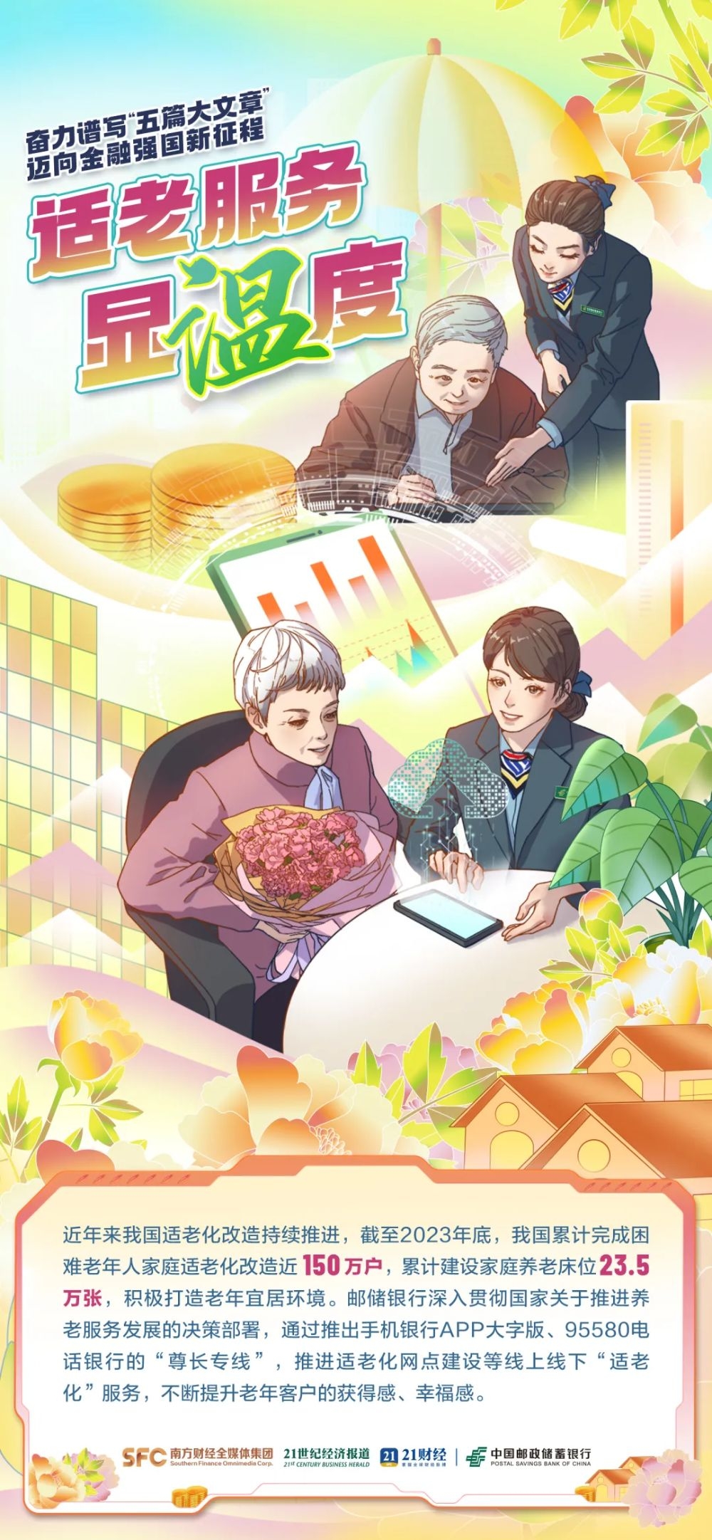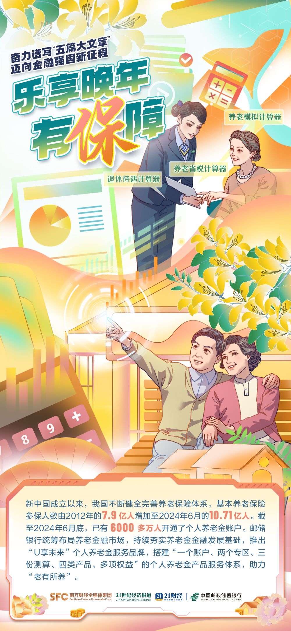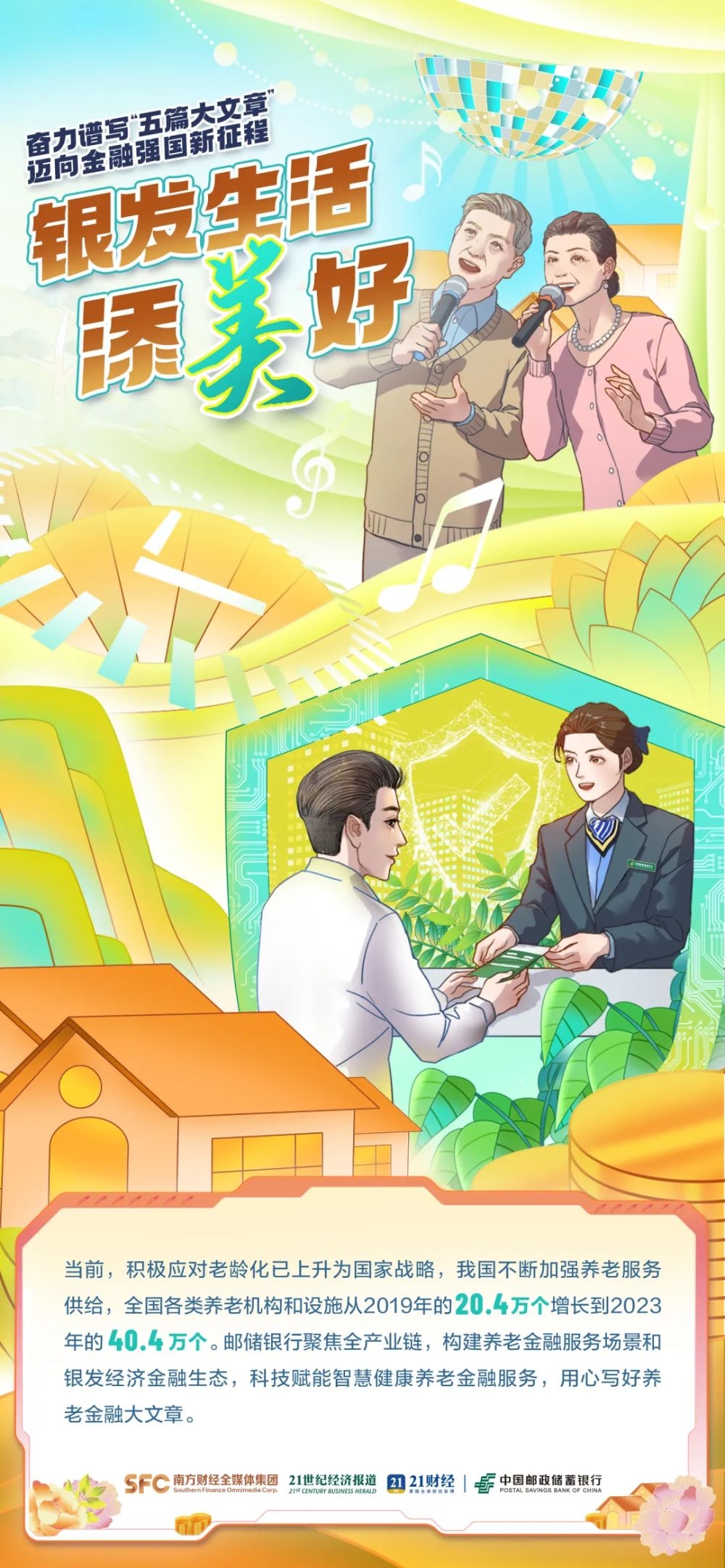 中央金融工作会议提出,做好科技金融、绿色金融、普惠金融、养老金融、数字金融“五篇大文章”,为金融强国建设指明方向。2024年是新中国成立75周年,是实现“十四五”规划目标任务的关键一年,值此之际,南方财经全媒体集团、21世纪经济报道与中国邮政储蓄银行联合推出“奋力谱写 ‘五篇大文章’ 迈向金融强国新征程”系列策划,以科技金融篇、绿色金融篇、普惠金融篇、养老金融篇、数字金融篇系列主题海报深入展现华夏大地75年来的发展变迁与辉煌成就,共同见证这片热土上绽放的新时代华章。 本文为【养老金融篇】,系列精美海报带您看邮储银行做精做细养老金融,以金融力量助力中国特色养老服务体系建设。 新中国成立75年来,我国养老保障能力逐步增强。作为“五篇大文章”之一,养老金融是实施积极应对人口老龄化国家战略的重要举措,为“老有所养”增添金融温度。 养老保障持续完善 守护安心生活 ▼ 养老产业蓬勃发展 构建舒心未来 适老化改造稳步推进 传递贴心关怀 数据来源:据民政部、人力资源和社会保障部、国家统计局、中国邮政储蓄银行等公开资料整理。 从初步探索到渐成体系,新中国成立75年来,我国养老事业实现跨越式发展。持续扩大基本养老保险覆盖面、建立国家基本养老服务清单制度、实施个人养老金制度······越织越密的养老保障网,托起幸福“夕阳红”。 党的十八大以来,我国养老事业发展驶入快车道,已建成世界规模最大的养老保险体系。近年来,我国养老事业和养老产业政策机制不断健全,养老金融产品持续丰富,“老有所养、老有所依”的图景正逐步照进现实。 邮储银行积极践行使命担当,全面构建“三横三纵”的立体式养老金融体系,面向未老客户、银发客户和家庭客户三类主体,深耕养老金金融、养老服务金融、养老产业金融三大领域,推动产品共享、服务共融、产业共建,与客户携手共创品质养老未来,成为陪伴在客户身边的养老暖心银行、国家养老金融全面推进的重要服务银行。 出品 | 21世纪经济报道×中国邮政储蓄银行 联合出品 总策划 | 袁丁 统筹 | 林军明 林青云 执行统筹 | 黄兰雯 设计统筹 | 李基礼 文案 | 黄兰雯 实习生王慧敏 罗倩茹 黄颖洁 设计 | 李基礼 吴怀宽 王冰 陈珊 黎旭廷 审校 | 张晔 黄志明 制作 | 创意互动中心