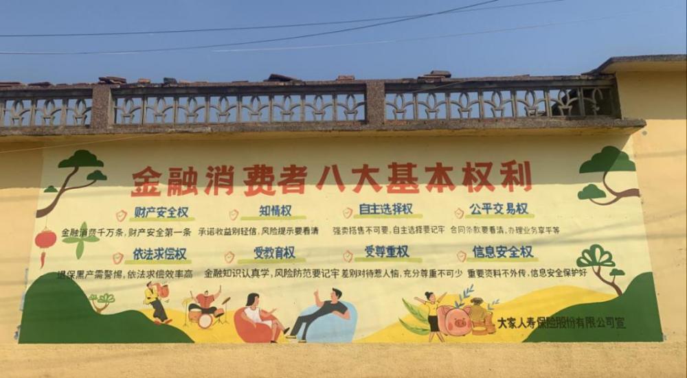 我为群众刷面墙,传递金融正能量。在山东、辽宁、江苏等地,大家人寿通过墙绘的形式向村民展示金融消费者八项基本权利,用简洁的话语将复杂的金融概念转化为通俗易懂的内容,让村民朋友看得懂、记得住、用得上。