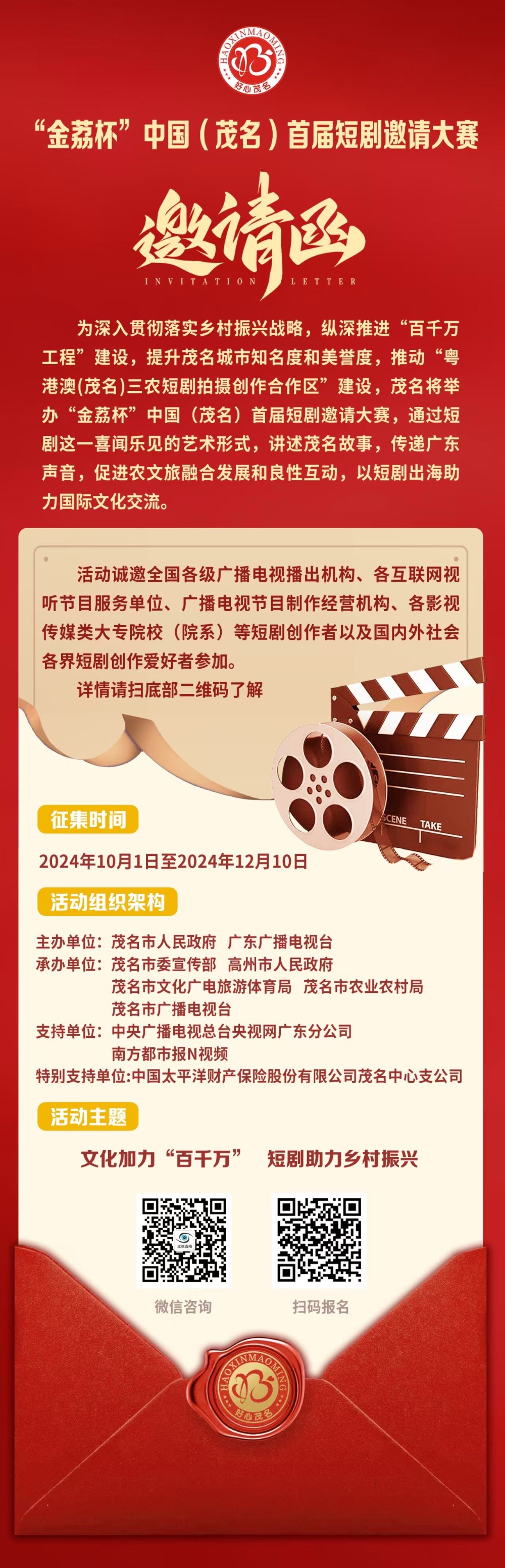 为深入推动乡村振兴战略和“百千万工程”建设,茂名市携手广东广播电视台隆重推出“金荔杯”中国(茂名)首届短剧邀请大赛。本次大赛特设20万元大奖,诚邀全国短剧创作者共襄盛举,用镜头讲述茂名故事,传递广东声音,助力乡村振兴和文化交流。