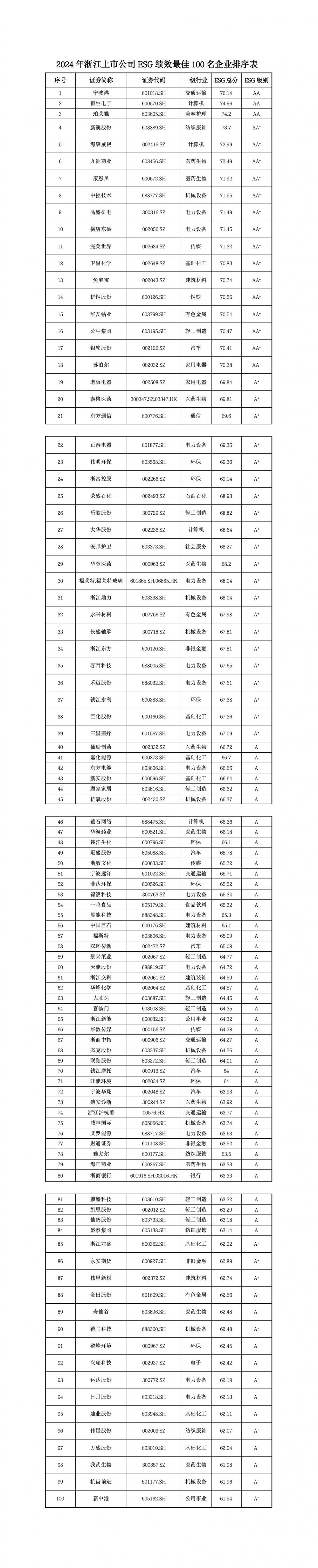 2024年浙江上市公司ESG绩效最佳100名企业最新出炉