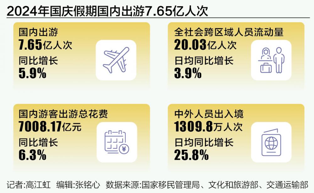除广东外,多个省市旅游人数、旅游收入双获增长。据文化和旅游部官网消息,国庆节假期全国国内旅游出游7.65亿人次,按可比口径(下同)同比增长5.9%,较2019年同期增长10.2%;国内游客出游总花费7008.17亿元,同比增长6.3%,较2019年同期增长7.9%。