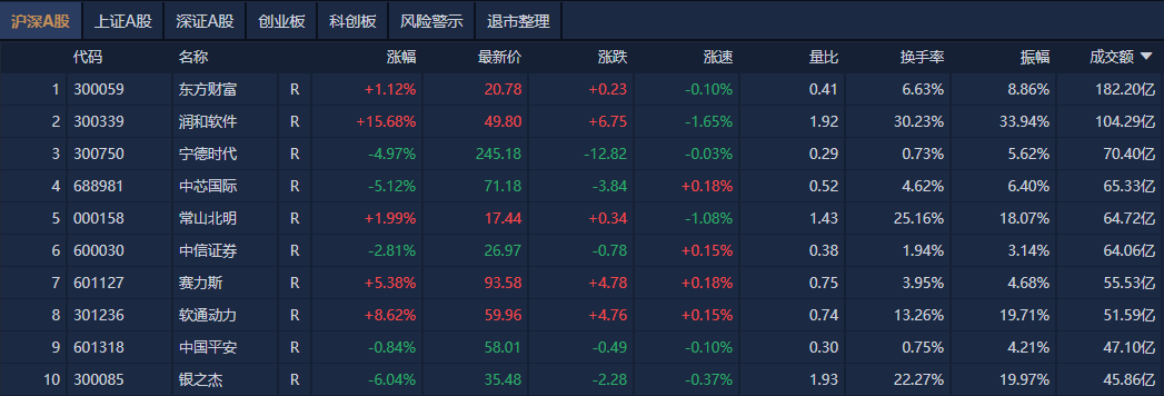 沪深两市半日成交额9836亿元,较上个交易日同期缩量4735亿元。个股方面,南财金融终端显示,东方财富成交额182.20亿元居首,润和软件、宁德时代、中芯国际成交额靠前。