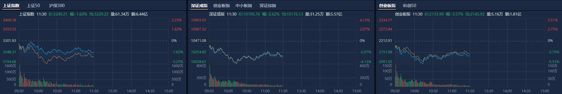 10月11日,市场早盘再度调整,创业板指领跌。南财金融终端显示,截至午间收盘,沪指跌1.6%,深成指跌2.62%,创业板指跌3.57%。总体上个股跌多涨少,全市场超4500只个股下跌。
