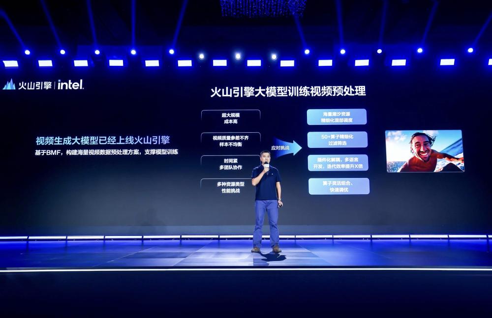 图说: 抖音集团视频架构负责人王悦介绍火山引擎大模型训练视频预处理方案。
