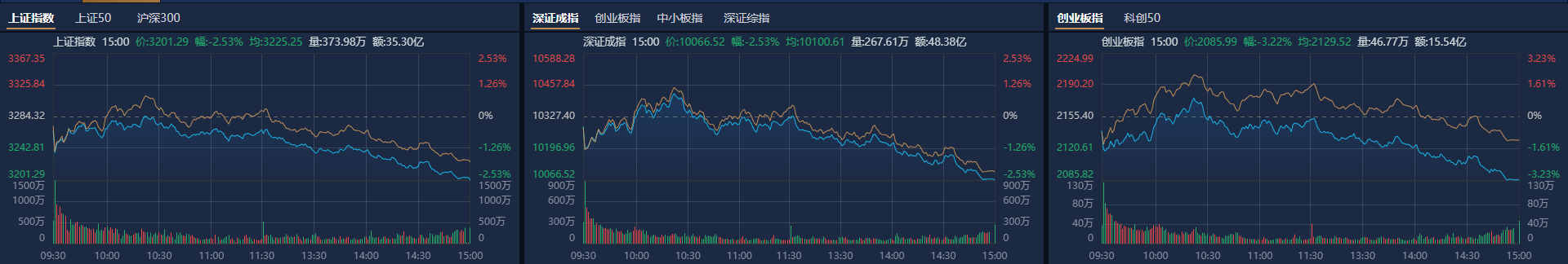 10月15日,市场全天震荡下挫,创业板指领跌。南财金融终端显示,截至收盘,沪指跌2.53%,深成指跌2.53%,创业板指跌3.22%。