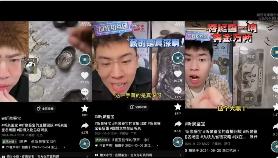 那些已成神级传说的直播名场面在网上流传,切片更养活了无数账号:有真·富豪拿出了保守估计价值在千万以上的军阀银元,几百万的翡翠手镯,两套一版能换一套北京四合院的猴票;有人自称“从博物馆拿出来的”古剑让鉴宝,有疑似摸金校尉在野外连麦中拍摄了疑似古墓石碑上的文字甚至盗墓洞……