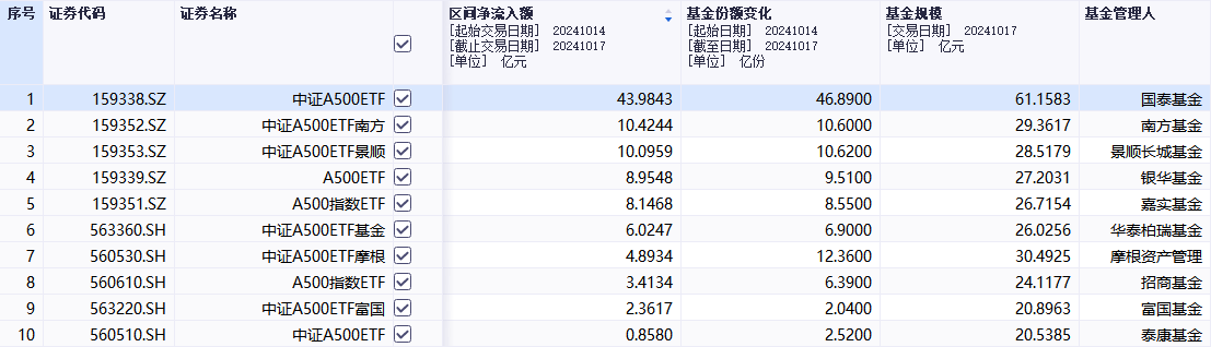 首批10只中证A500ETF连日来热度只增不减,截至10月17日,基金规模合计超295亿元。