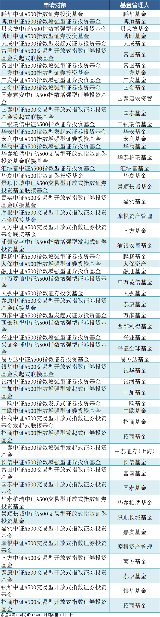 同花顺iFind显示,目前有44只中证A500指数产品处于申报审核流程中。