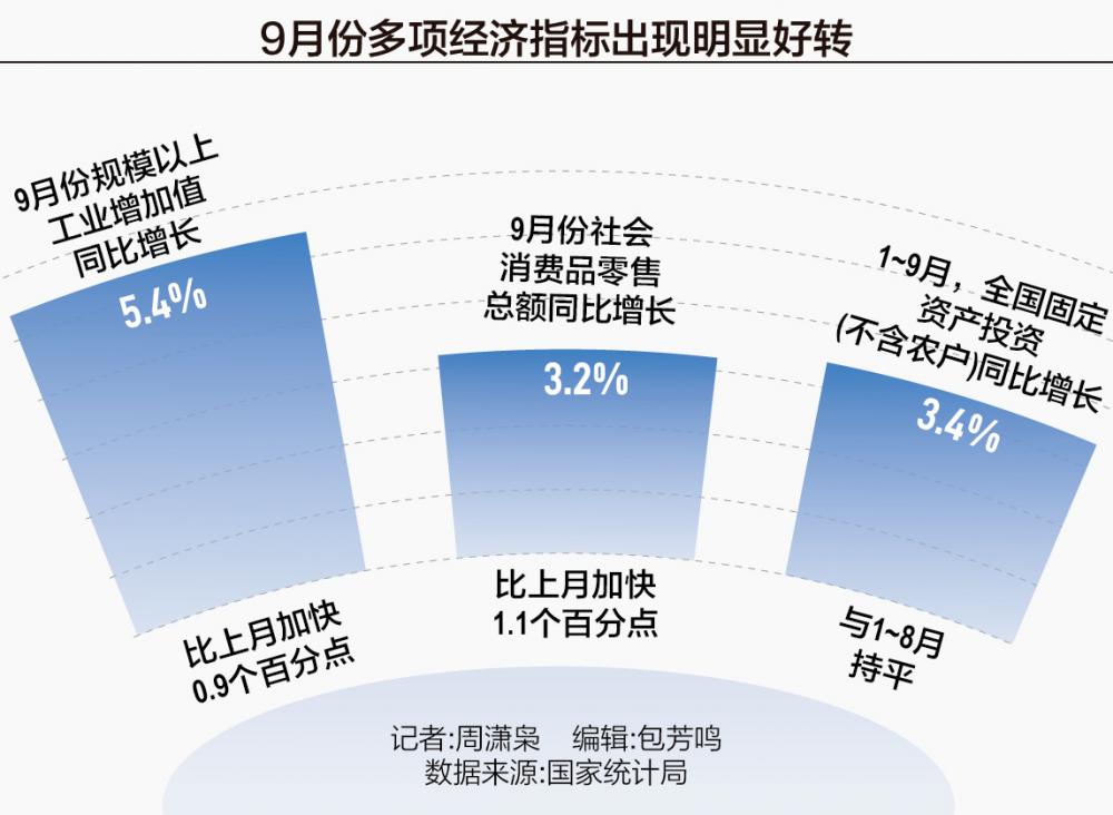 不过,9月当月数据较上月有所回暖,9月出口有所走弱,社会消费品零售总额增速有所回升,投资增速则趋于企稳。