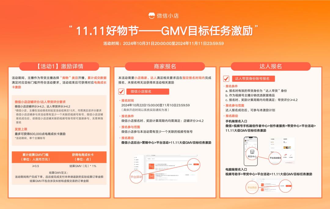 日前,微信小店便发布了《微信小店11.11好物节活动激励计划》,分为GMV目标任务激励、跨店每满50元减5元优惠激励、11.11主会场展示三项活动。参与活动最高获60万点流量激励,满减活动商品技术服务费率减至1%。