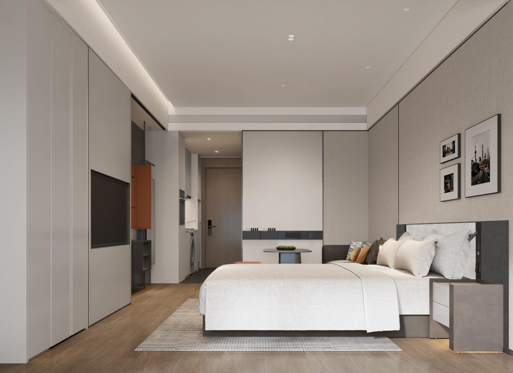 房间最大的设计亮点当属可移动电视墙,这一设计使得电视可灵活周转于睡眠区用于观影、或在办公区进行投屏,实现休闲办公“双场景一键切换”。同时,电视墙与衣柜、储物区完美组合。除一侧的长住储藏柜外,住客可以通过墙体移动,将墙面背后的空间按照生活常用或装饰点缀进行调节,方便拿取或进行展示。