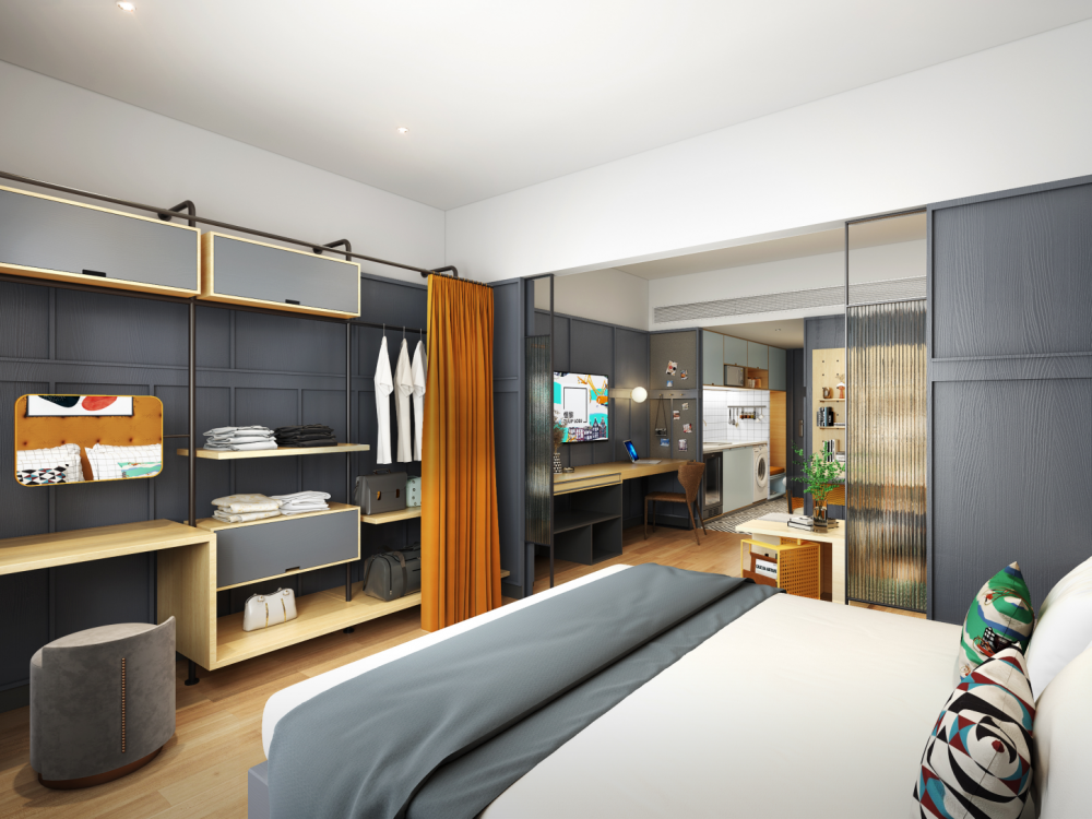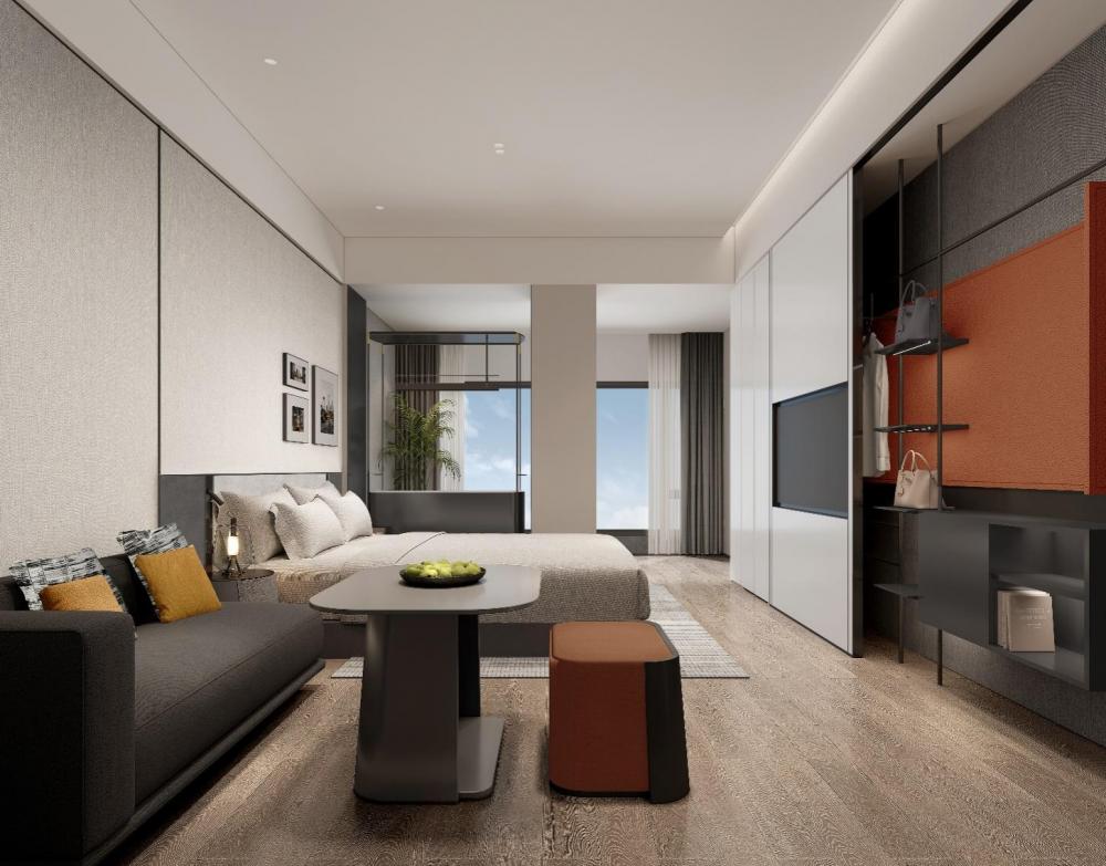 厨房:配备冰箱、洗烘一体洗衣机、微波炉、炊具,并根据不同房型需求增配抽油烟机及电磁炉、直饮净水器等,在满足住客生活烹饪需求的同时,确保健康生活环境。