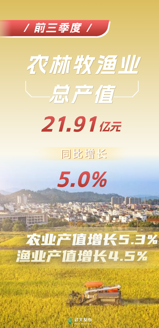 前三季度,全县实现农林牧渔业总产值21.91亿元,同比增长5.0%。分行业看,农业产值16.58亿元,增长5.3%;林业产值0.96亿元,增长2.3%;牧业产值2.69亿元,增长4.1%;渔业产值0.71亿元,增长4.5%;农林牧渔专业及辅助性活动产值0.97亿元,增长6.8%。