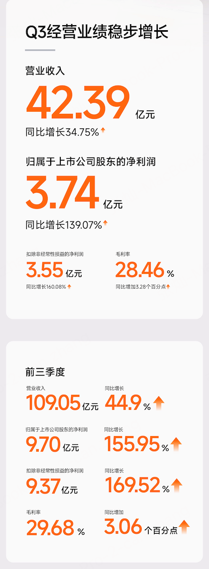 10月28日,九号公司发布2024年第三季度业绩报告,实现单季度营业收入42.39亿元,同比增长34.75%;归属于上市公司股东的净利润3.74亿元,同比增长139.07%;扣除非经常性损益后的净利润3.55亿元,同比增长160.08%。整个前三季度公司实现营收109.05亿元,同比增长44.9%;实现归属于上市公司股东的净利润9.7亿元,同比增长155.95%;公司毛利率同比增长3.06个百分点至29.68%。