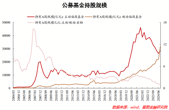 公募基金方面,是本轮牛市非常重要的一个资金来源,但更主要的是来自于被动指数型基金。主动权益型基金虽然仓位有所提升,且业绩较大回暖,但扔遭遇基民“回本赎回”的困境。以主动权益型基金新发+净申购的规模来看,三季度仍是大幅净流出的状态,根据民生证券的统计来看,主动权益型基金净流出规模从2024Q2的 723.31亿元回升至2024Q3的1093.51亿元,且已经是连续6个季度遭遇资金净流出。对比之下,被动指数型基金已经连续 6 个季度获得大量增量资金。