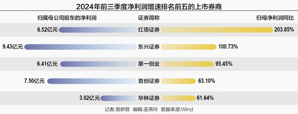 WIND统计数据显示,今年前三季度净利增速排名前十的券商依次是:红塔证券、东兴证券、第一创业、首创证券、华林证券、山西证券、华泰证券、南京证券、长江证券、华安证券。