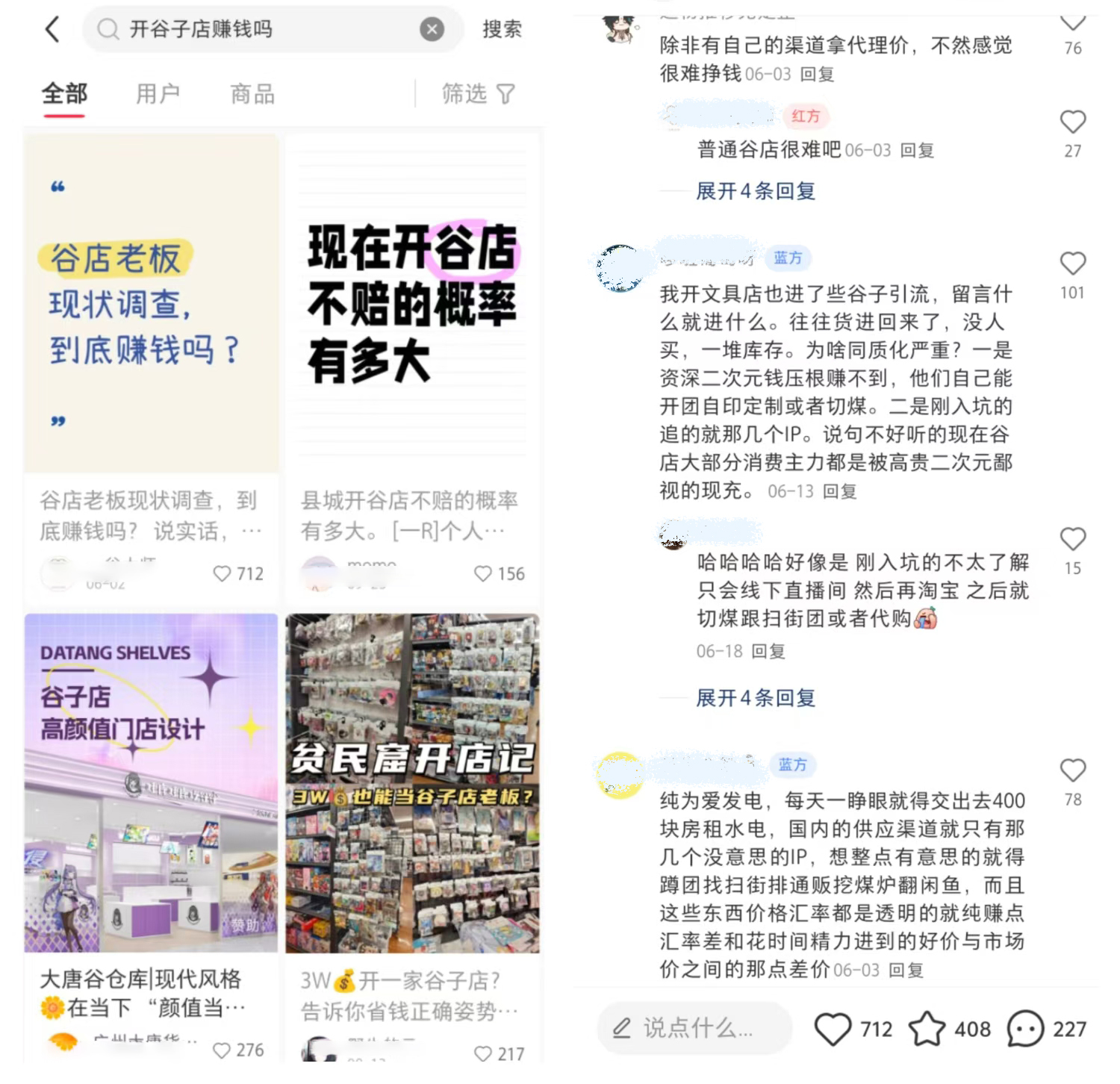 这个道理很多人都懂,但仍然挡不住开店热潮,在社交平台上可以看到,各色开谷店攻略的帖子层出不穷,但打开评论却看到多数人对于开谷店的负面评价,大多集中在房租水电较高、货源不稳定、同质化严重、IP代理难拿......