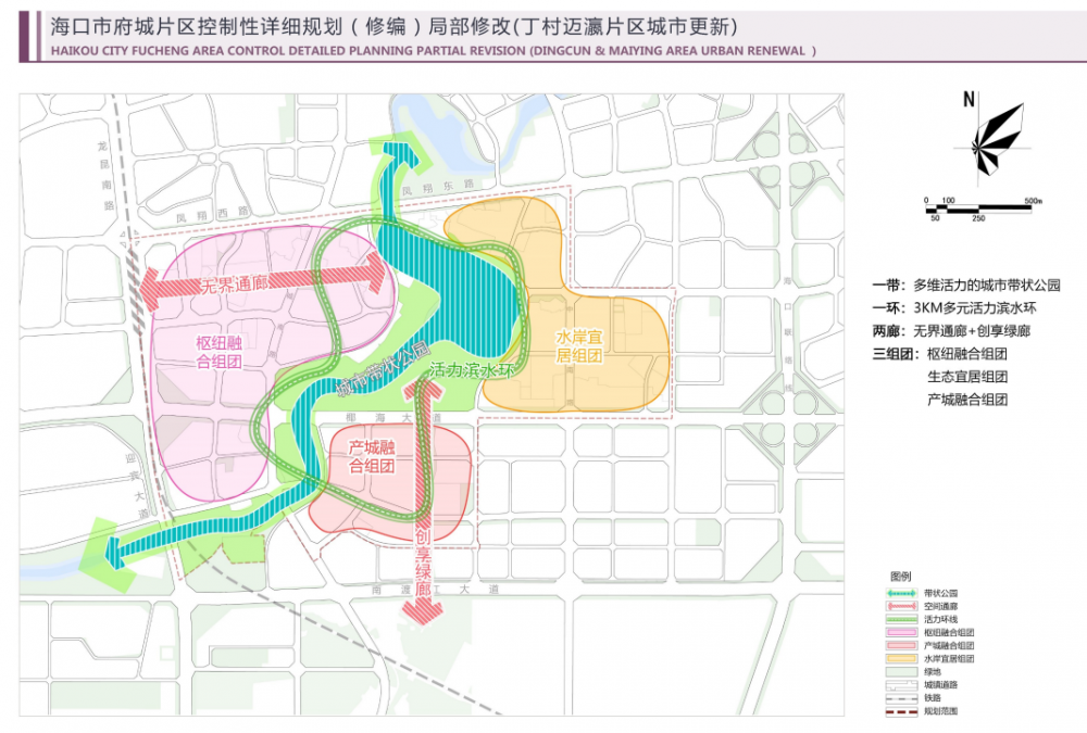 丁村迈瀛片区依托滨水慢行连廊,串联商业商贸、人文邻里、社区服务、文化娱乐、生态景观空间,构建3公里多元活力滨水场景。创造多样的水岸边界,塑造具有烟火气的城市魅力场景,成为自然环境与城市生活无边界的交往客厅,规划在凤翔湿地公园东岸、西岸,打造活力社区商业业态;在海口东站西侧交通发展轴上,打造区域总部经济及商业服务业业态。