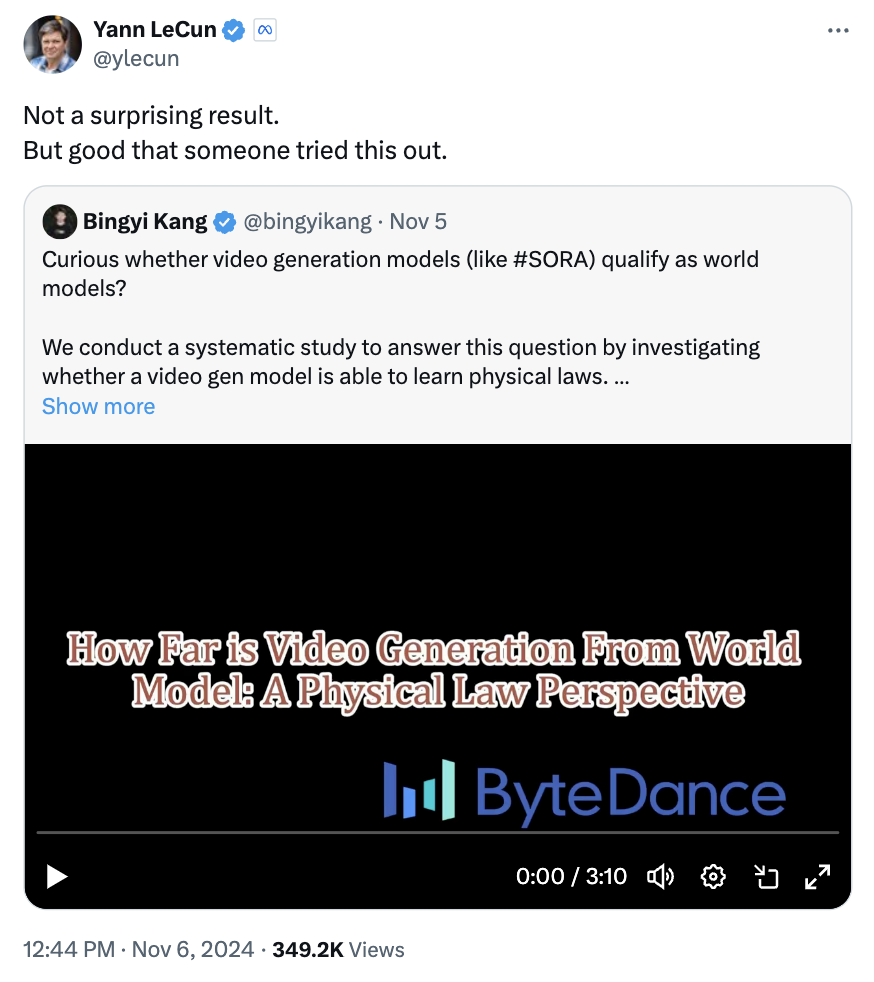 图灵奖得主、Meta首席AI科学家杨立昆点赞并转发了该研究,表示“结论不令人意外,但很高兴终于有人做了这个尝试!”