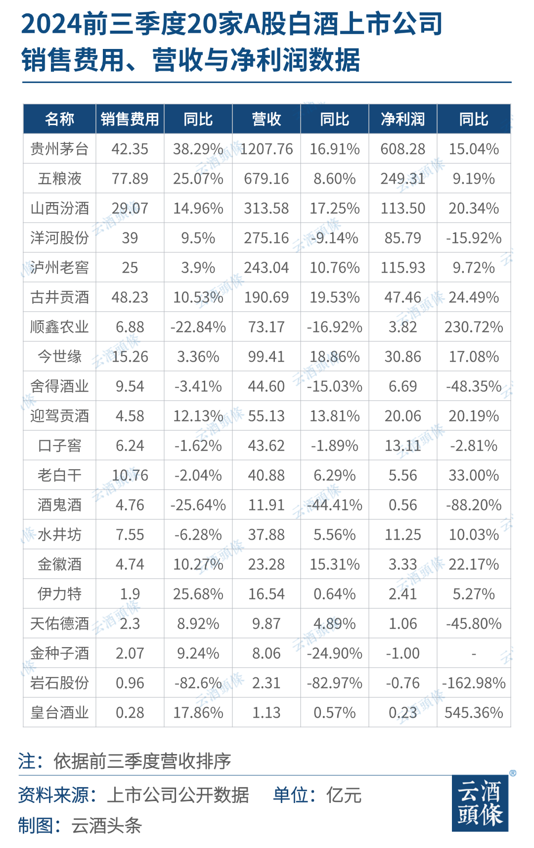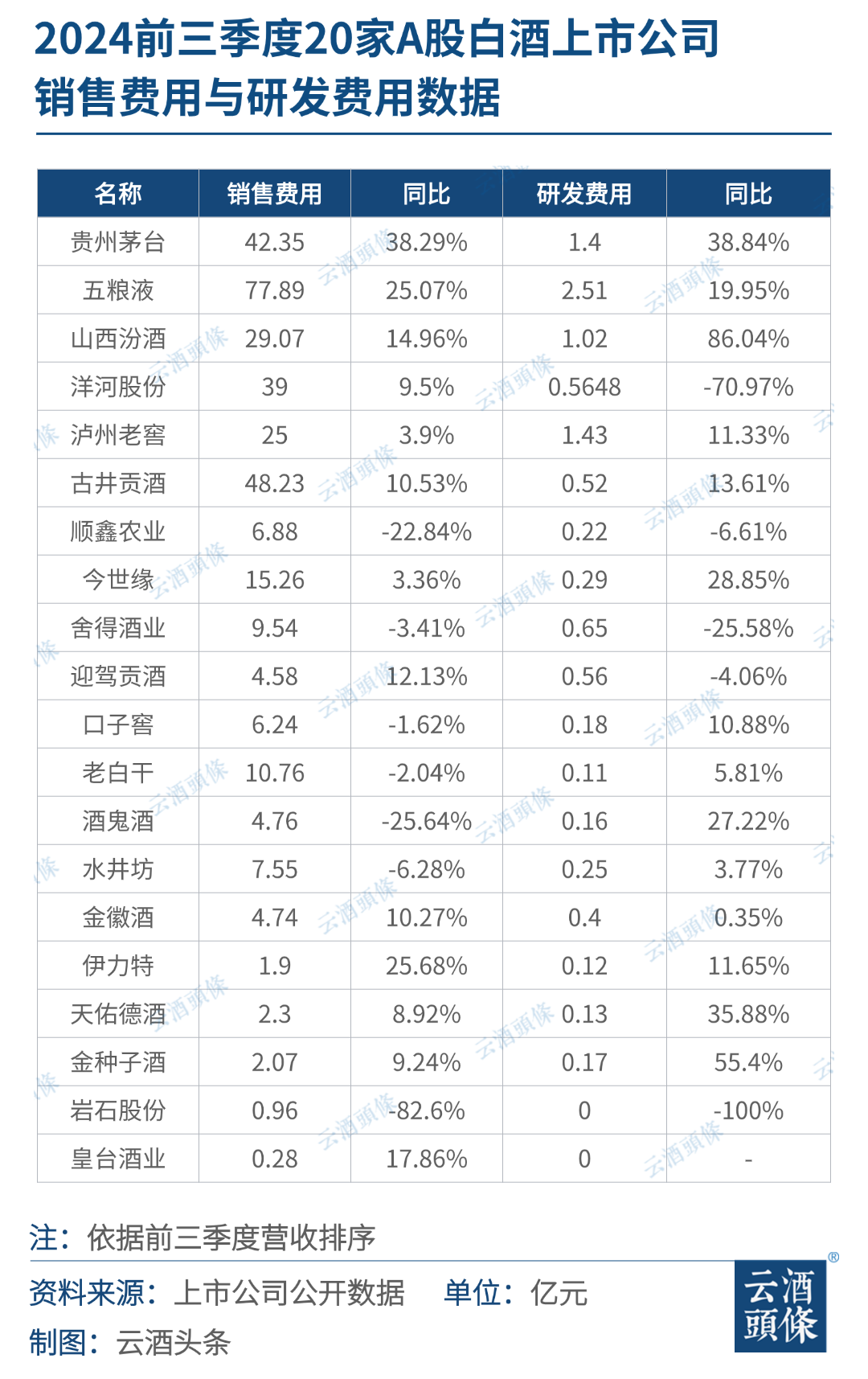 如水井坊前三季度销售费用减少了6.28%,营收同比增长5.56%,达37.88亿元;老白干酒前三季度销售费用同比减少2.04%,营收同比增长6.29%,为40.88亿元。