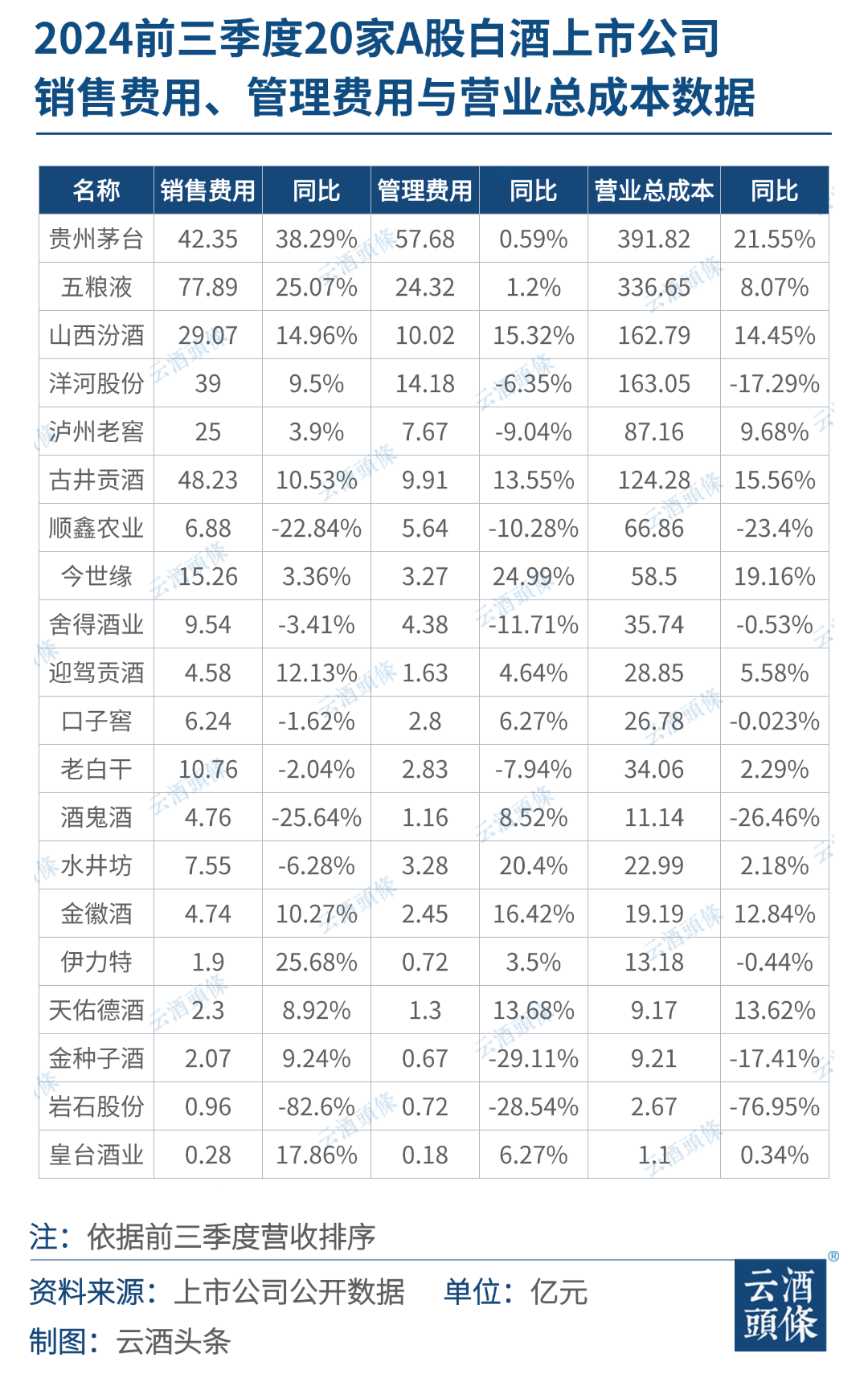 降低管理费用、缩减销售费用是企业缩减总营业成本的重要指标。今年前三季度,白酒上市企业普遍展现出“该省省、该花花”的精细化管理意图。