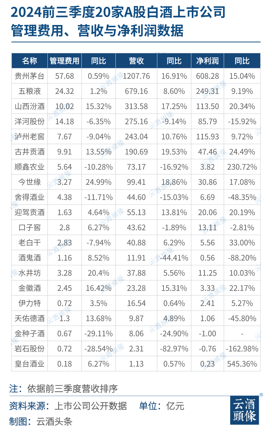 数据显示,今年前三季度,泸州老窖管理费用下降9.04%,净利润增长了9.72%;顺鑫农业管理费用下降10.28%,净利润为3.82亿元,同比增长230.72%;老白干酒管理费用下降7.94%,净利润5.56亿元,同比增长33%,业绩表现明显优于去年同期超过20%的净利润下滑,也是其近五年来的最高净利润水平。