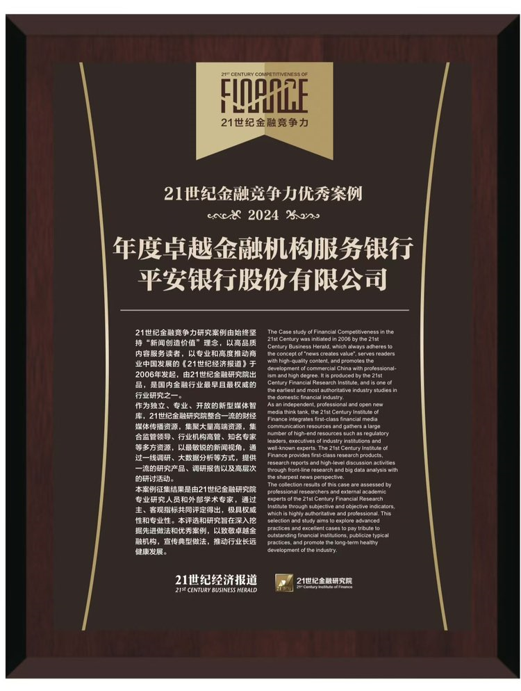 11月9日,“第十九届21世纪金融年会”在北京盛大举行。会议期间,“2024年21世纪金融竞争力研究案例”评选结果揭晓,平安银行以其卓越的表现荣膺“年度卓越金融机构服务银行”奖项。