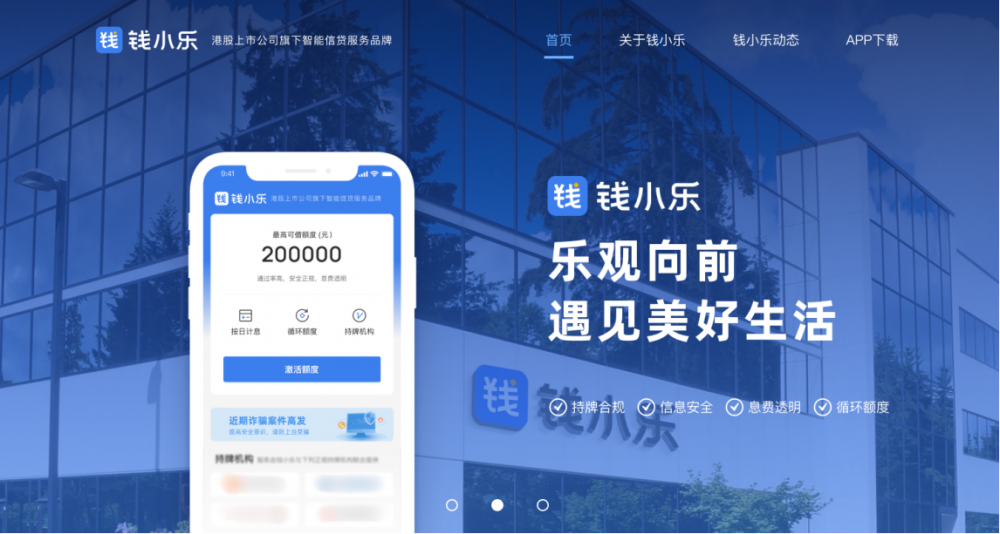 官网显示,钱小乐是港股上市公司旗下智能信贷服务品牌,以“乐观向前,遇见美好生活”为服务理念,通过与持牌金融机构合作,同时广泛布局和嵌入多元生态场景,为个人用户和小微企业提供安全、智能、触手可及的信贷服务。具有申请简单、额度高、放款快、息费透明等特点。