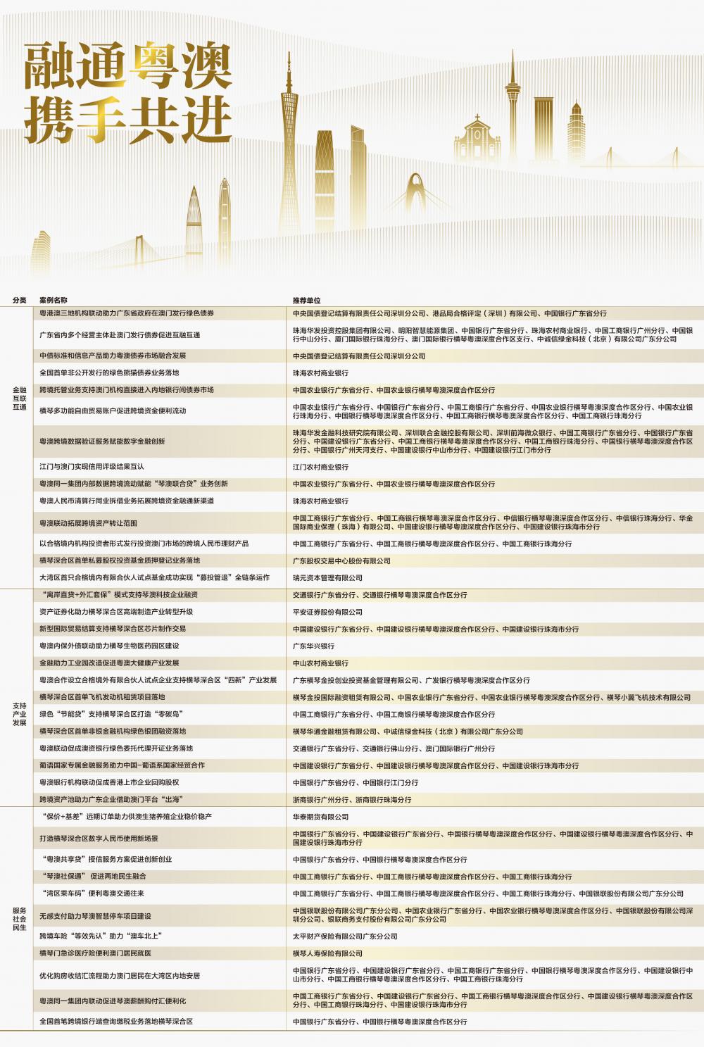 本次入围典型案例分为“金融互联互通”、“支持产业发展”和“服务社会民生”三大类,入围案例主体涵盖银行、证券、期货、基金、保险及金融基础设施运营机构、非银行支付机构、地方金融国企、地方金融组织、金融科技企业、第三方服务企业和实体企业。案例集中展示了过去三年来广东省金融机构在服务粤澳融合发展及横琴建设过程中的创新实践成果。