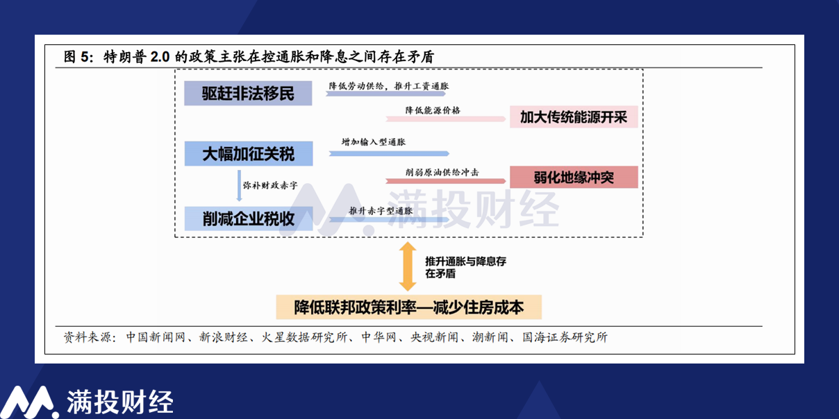美联储在政策端的压力主要来源于通胀。从特朗普的政策纲领来看,其主张的加关税、降企业赋税、激进移民政策,在维持美国经济韧性的同时,对通胀的抬升也会非常明显。尽管自九月以来,美联储的重心更聚焦于失业率方面的数据,但这并不代表美联储可以忽视过去两年的降通胀努力,通胀抬升的压力,开始逼迫美联储重新审视规划降息的进程。