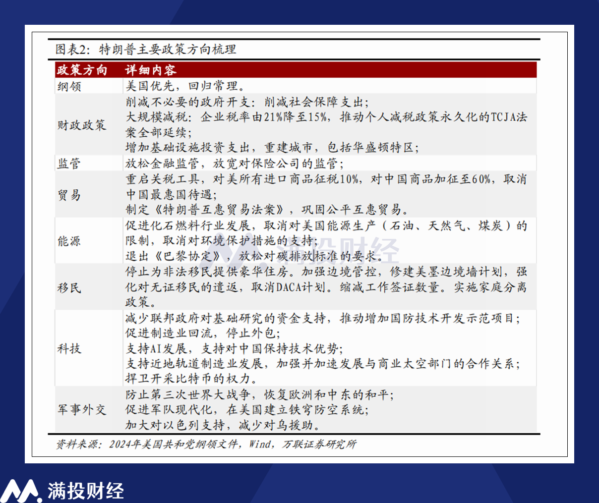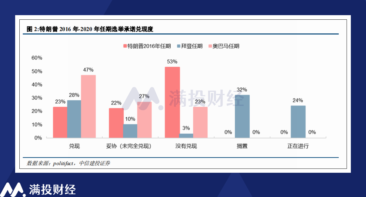 从历史情况来看,对美国国内影响较小的,矛头对外的承诺往往更容易实现。以本届特朗普政府的纲领来看,诸如提高关税、推出贸易协定、削减对外防务支出等政策是容易落地的。而对内的政策往往要考虑更多影响,诸如移民问题本就难以处理,其承诺自然也没那么好落实,因此更多会聚焦于行政端,诸如企业所得税等方面。