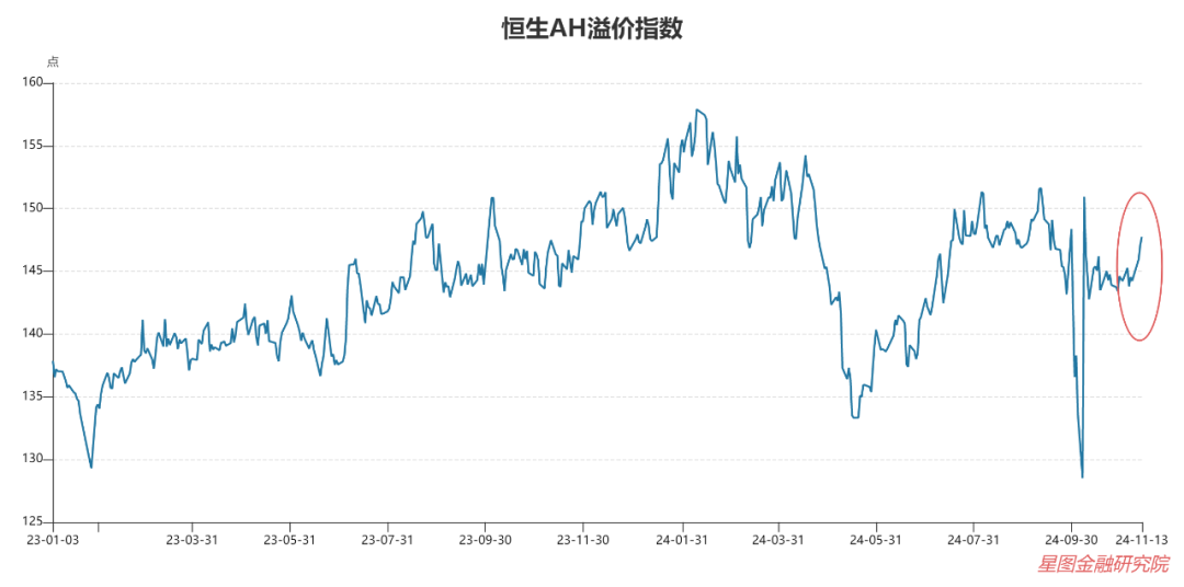 受港股和A股走势背离影响,近期恒生AH溢价指数(AH溢价指数=∑(A股价格*总股本*汇率)/∑(H股价格*总股本)*100,衡量两地上市公司在A股与港股的估值倍数,数值越高,表明港股相比A股越便宜)快速反弹至148点附近。相比A股,港股再次展现出较高的性价比。