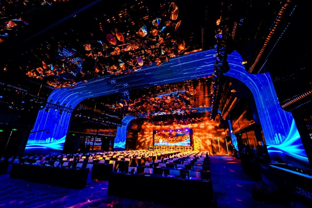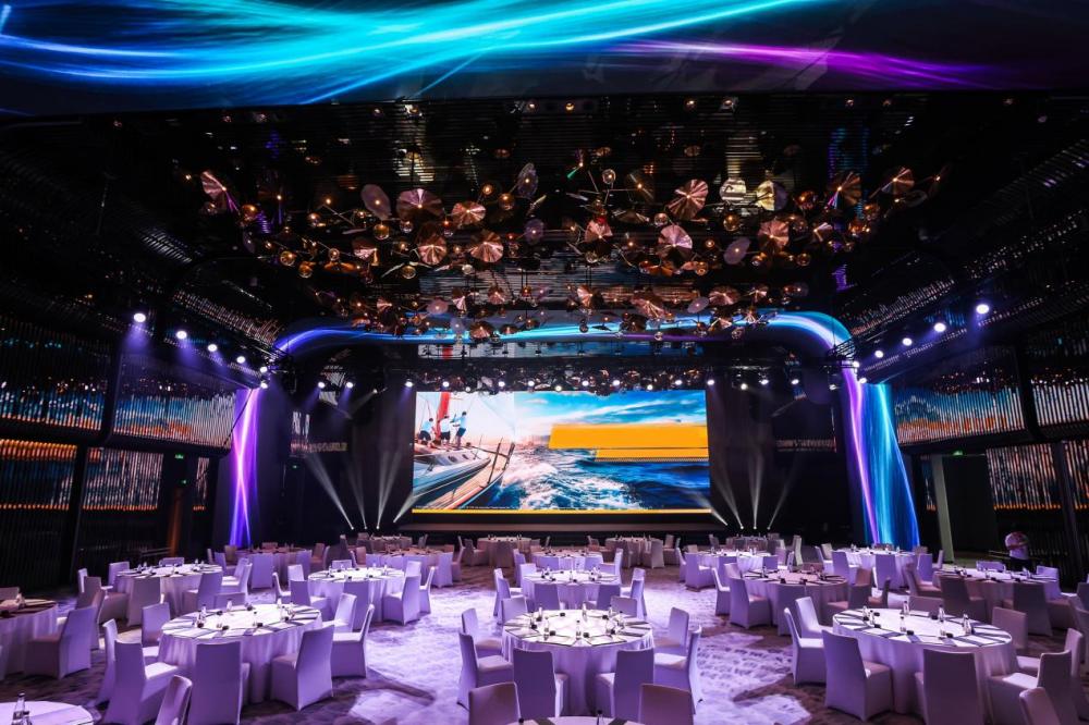 当步入青岛美高梅酒店的宴会厅时,首先映入眼帘的便是 LED 拱形屏幕。其独特的拱形设计,仿佛一道绚丽的彩虹横跨在空间之上,为整个场地增添了一抹奇幻的色彩,成为青岛独树一帜的宴会厅标志。