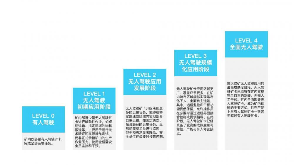 据报告显示,该模型指标涵盖煤矿矿区内无人驾驶车辆的占比情况、常态化无人、无人驾驶车辆效率、矿区内的应用环节分布、采煤/剥离运输产能占比、运行里程占比、通信与数据传输能力、安全监控与预警能力以及智能调度能力等。根据对上述指标的评分,将露天煤矿无人驾驶的应用成熟度划分为五个等级(LEVEL0-LEVEL4),每一级均标志着露天煤矿无人驾驶应用程度的深化与效能的提升。