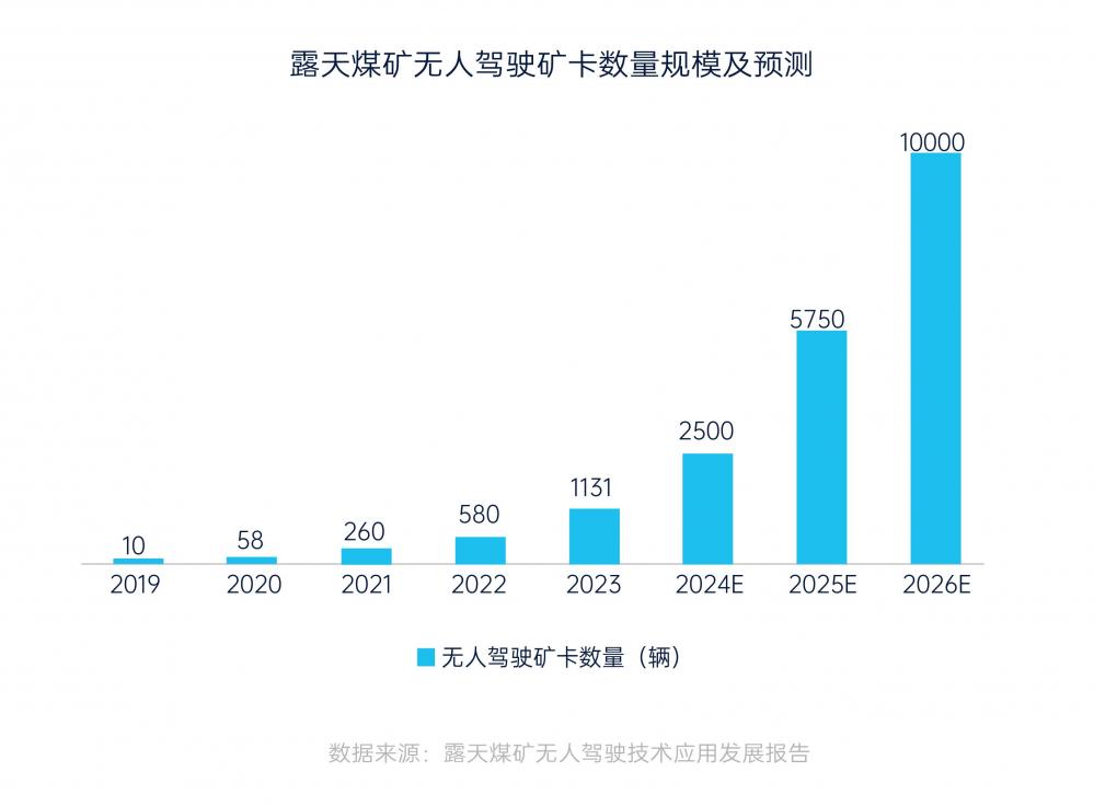 在露天煤矿,矿卡是矿内主要运输工具。据报告显示,2023年露天煤矿矿卡数量为30000辆,并预测2024-2026年将分别达到31000辆、32000辆、33000辆的规模。近年来,在降本、提效、保安、节能、减碳的综合需求下,露天煤矿无人驾驶矿卡需求快速增长。报告表明,2023年我国露天煤矿无人驾驶矿卡有1131辆,2024年9月增至1510辆。预计2024年底将超2500辆,较2023年实现翻倍。未来,随着露天煤矿数字化加速转型,无人矿卡需求将持续释放,预计2026年将迎来爆发式增长。