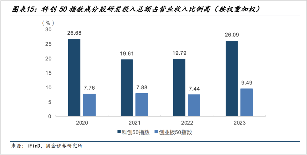 数据显示,从2020年底到2023年底,科创50成分股研发投入总额占营业收入比均在20%左右。