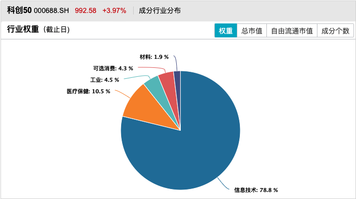 之所以称它是“硬科技”标杆,首先,科创50聚焦信息技术、医疗保健、工业、等科技含量较高的行业,这些行业的合计占比超过了90%。
